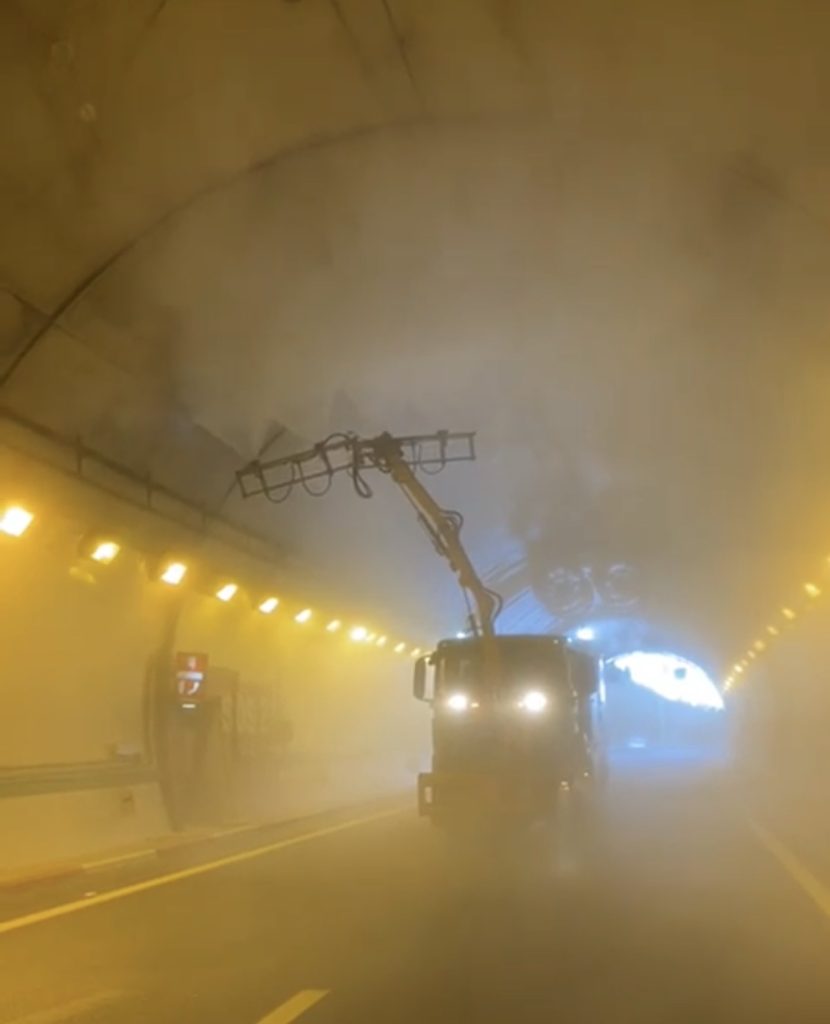 Este vehículo integra brazos articulados con rodillos/cepillos giratorios capaces de adaptarse al gálibo del túnel y cubrir hastiales, bóvedas y paramentos verticales de forma continua.