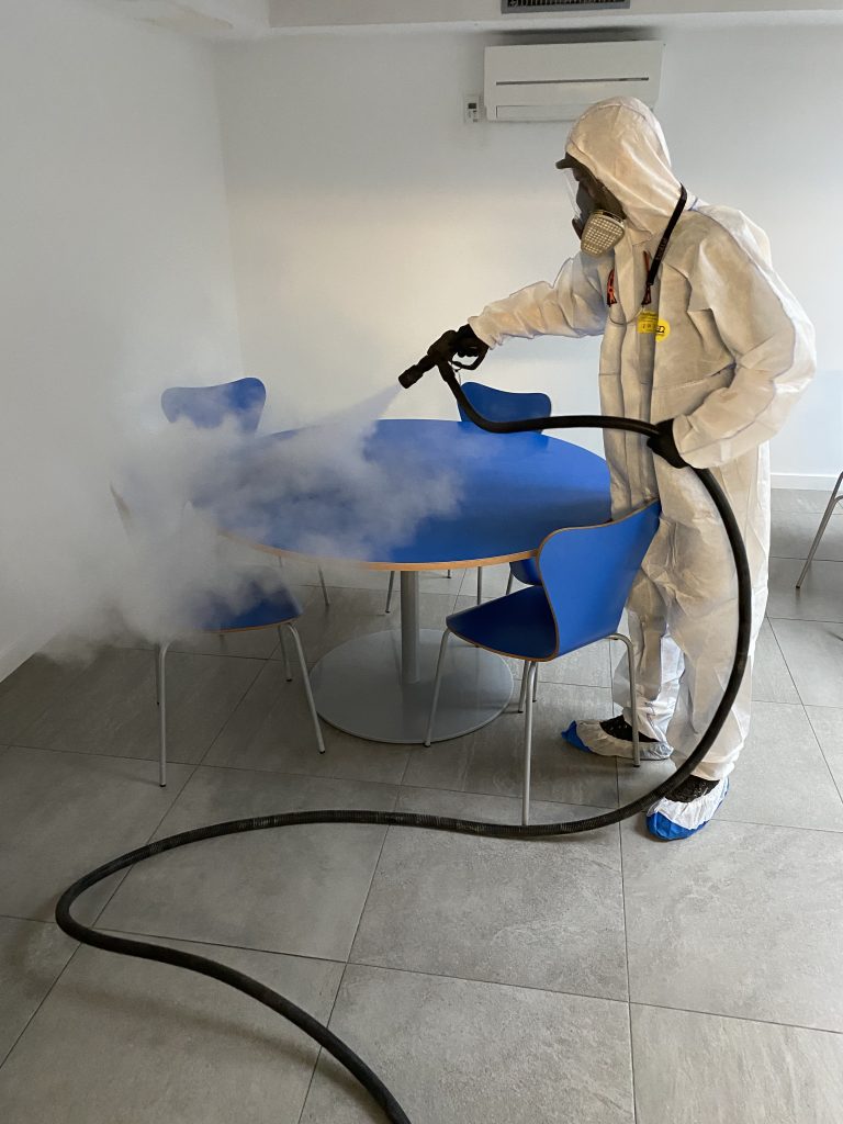 Para la realización de los servicios de desinfección, nuestro personal cuenta con equipos de protección individual conformados por monos de protección desechables, guantes desechables, cubre calzados, mascaras de protección respiratoria, maquina de generación de gas ozono y todos los implementos y productos químicos necesarios para la realización de las tareas.